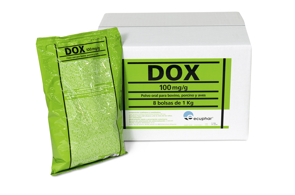 INDICAÇÃO Suínos: Tratamento de infeções respiratórias provocadas por microrganismos sensíveis à doxiciclina: pleuropneumonia, pneumonia enzoótica, pasteurelose e rinite atrófica. Vitelos: Tratamento de infeções respiratórias provocadas por microrganismos sensíveis à doxiciclina (pneumonias). Aves: Tratamento da Micoplasmose, Colibacilose, doença respiratória crónica (C.R.D.) e, em geral, de infeções provocadas por microrganismos sensíveis à doxiciclina. POSOLOGIA Via oral. 10 mg de doxiciclina/kg p.v./dia, durante 4-5 dias INTERVALO DE SEGURANÇA Carne: 5 dias